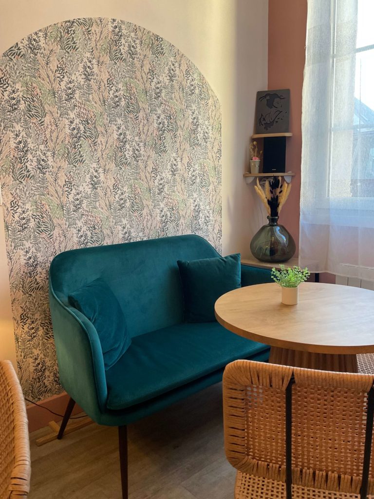 Pour fêter les 10 ans de son salon de thé, Sophie souhaitait redonner un nouvel éclat à sa salle de réception. Elle voulait que ce lieu soit accueillant dans un esprit naturel, et que la décoration soit à la fois douce et surprenante. De la couleur des murs jusqu'au choix du mobilier, en passant par l'agencement de l'espace, j'ai accompagné ma cliente dans ce projet d'aménagement et de décoration et créé un lieu où douceur et convivialité sont au rendez-vous.